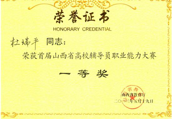 杜瑞平2013年5月获首届山西省高校辅导员职业能力大赛一等奖