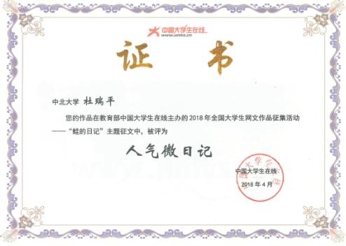 杜瑞平2018年4月在教育部中国大学生在线主办的2018年全国大学生网文作品征集活动中北评为“人气微日记”